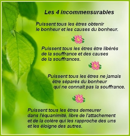 - représentent les 4 qualités illimitées : amour bienveillant, compassion, joie inclusive et équanimité